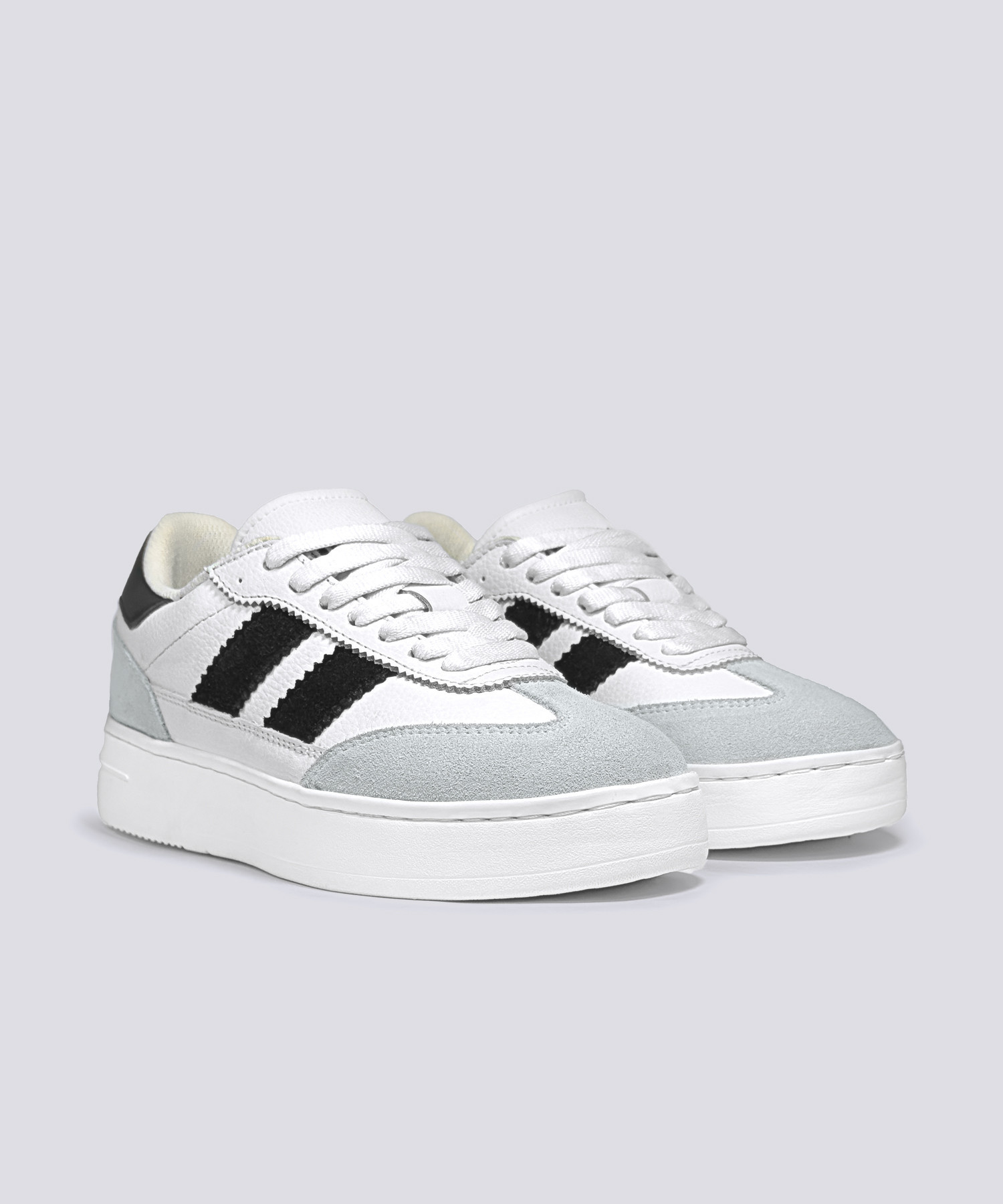 mientras los detalles en gamuza gris refuerzan la puntera y el talón. Sus icónicas franjas laterales en negro realzan el look clásico.